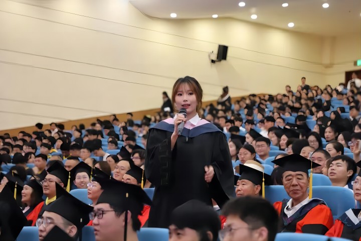 随后,典礼议程逐项进行。毕业生代表徐小喻、在校生代表戴文昊、教师代表周传爱、学生家长代表王光斌、杰出校友代表刘永明、用人单位代表彭建斌分别进行发言,表达了对2025届全体毕业生的不舍与祝福。