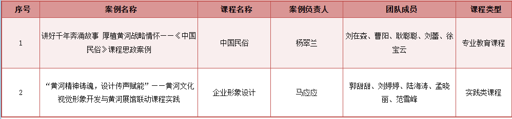 此次入选的案例分别为杨翠兰团队申报的《讲好千年奔涌故事 厚植黄河战略情怀 ——〈中国民俗〉课程思政案例》,以及马应应团队申报的《“黄河精神铸魂,设计传声赋能”—— 黄河文化视觉形象开发与黄河展馆联动课程实践》。杨翠兰团队获评专业教育课程优秀案例,马应应团队获评实践类课程优秀案例。
