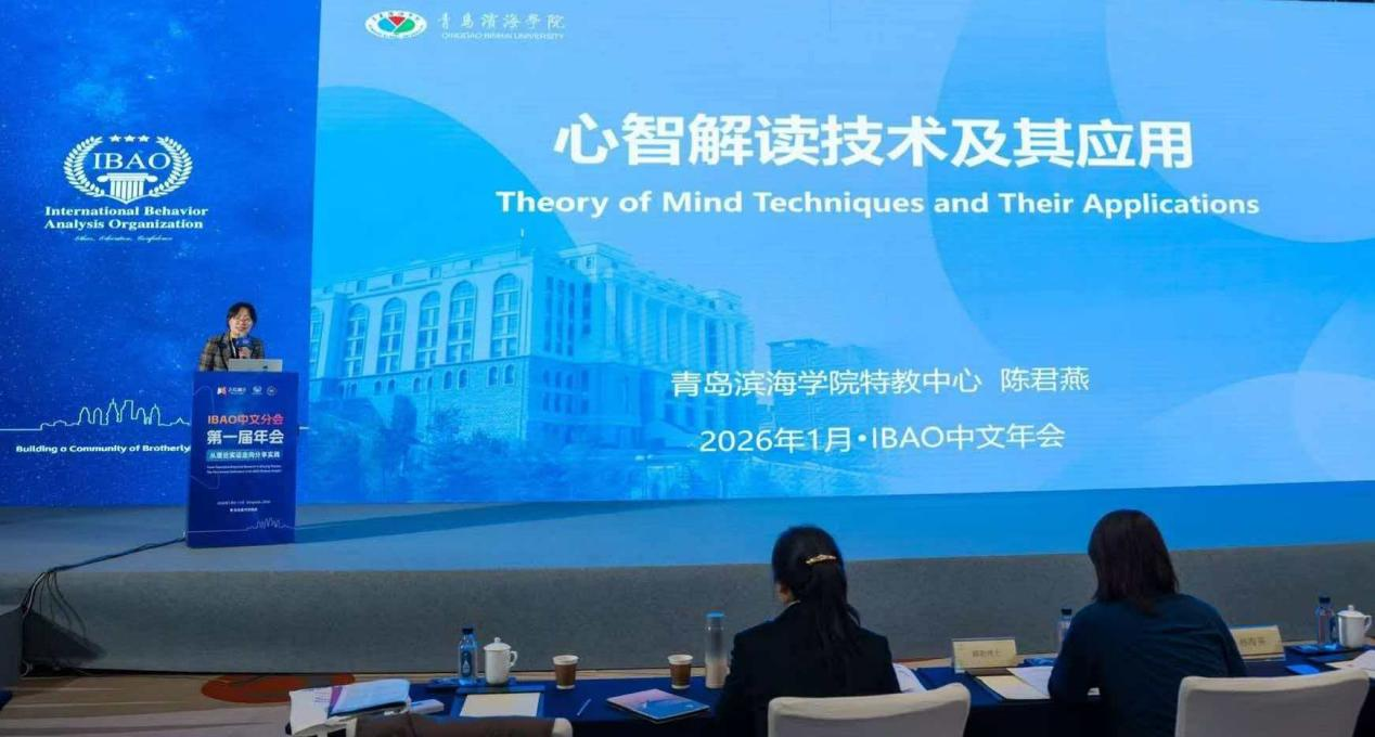 1月9日至11日,新兴国际行为分析师认证组织IBAO(International Behavior Analysis Organization)首届中文年会在青岛举行。青岛滨海学院特教中心主任、孤独症康复研究院副院长陈君燕受邀出席,并作题为《心智解读技术及其应用》的专题报告
