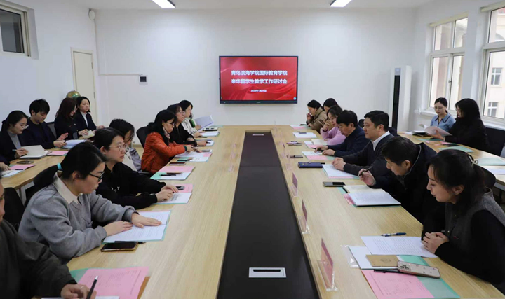 1月26日,青岛滨海学院来华留学生教学工作研讨会在地球村302会议室召开。副校长翟明戈、校长助理兼教务处处长冯志杰、质量与监控办公室主任梅泽民、外国语与国际合作学院院长佟若瑶、商学院副院长于艺、相关职能部门负责人及全体留学生任课教师参会。
