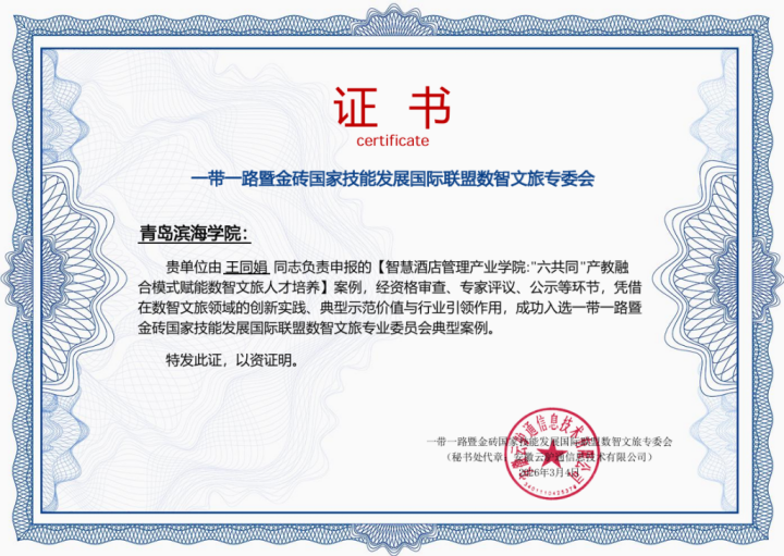 近日,一带一路暨金砖国家技能发展国际联盟数智文旅专业委员会公布典型案例评选结果,校酒店管理学院院长王同娟主持申报的《智慧酒店管理产业学院:“六共同”产教融合模式赋能数智文旅人才培养》项目成功入选,获专项证书认定。